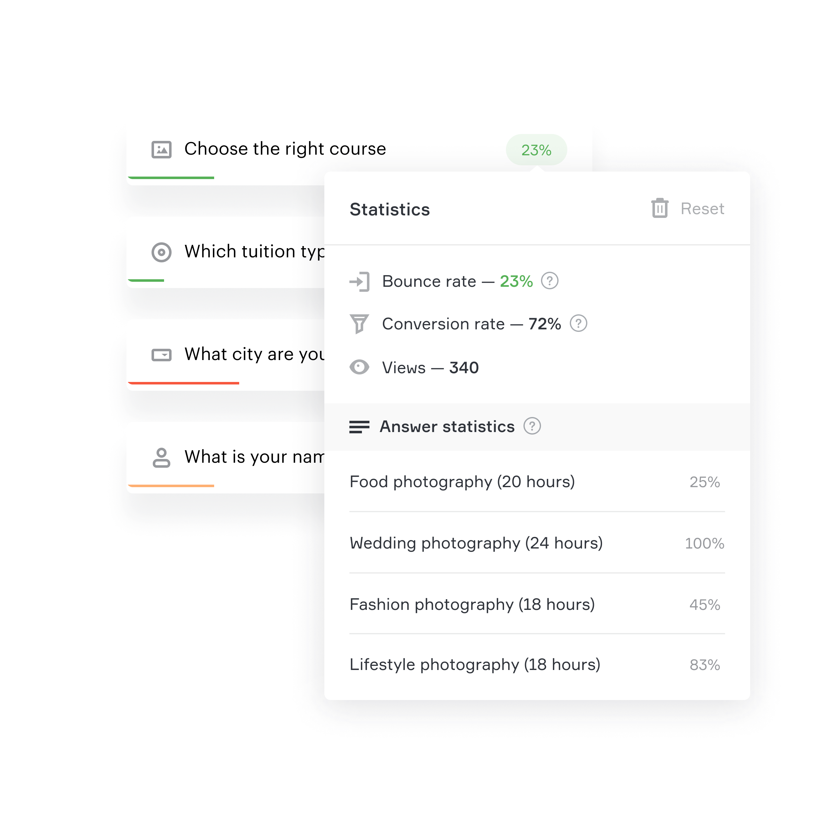 Vous pouvez consulter le taux de rebond pour chaque question et le pourcentage de choix pour toutes les options de réponse. Cela aide à identifier les questions qui provoquent le taux de rebond le plus élevé.